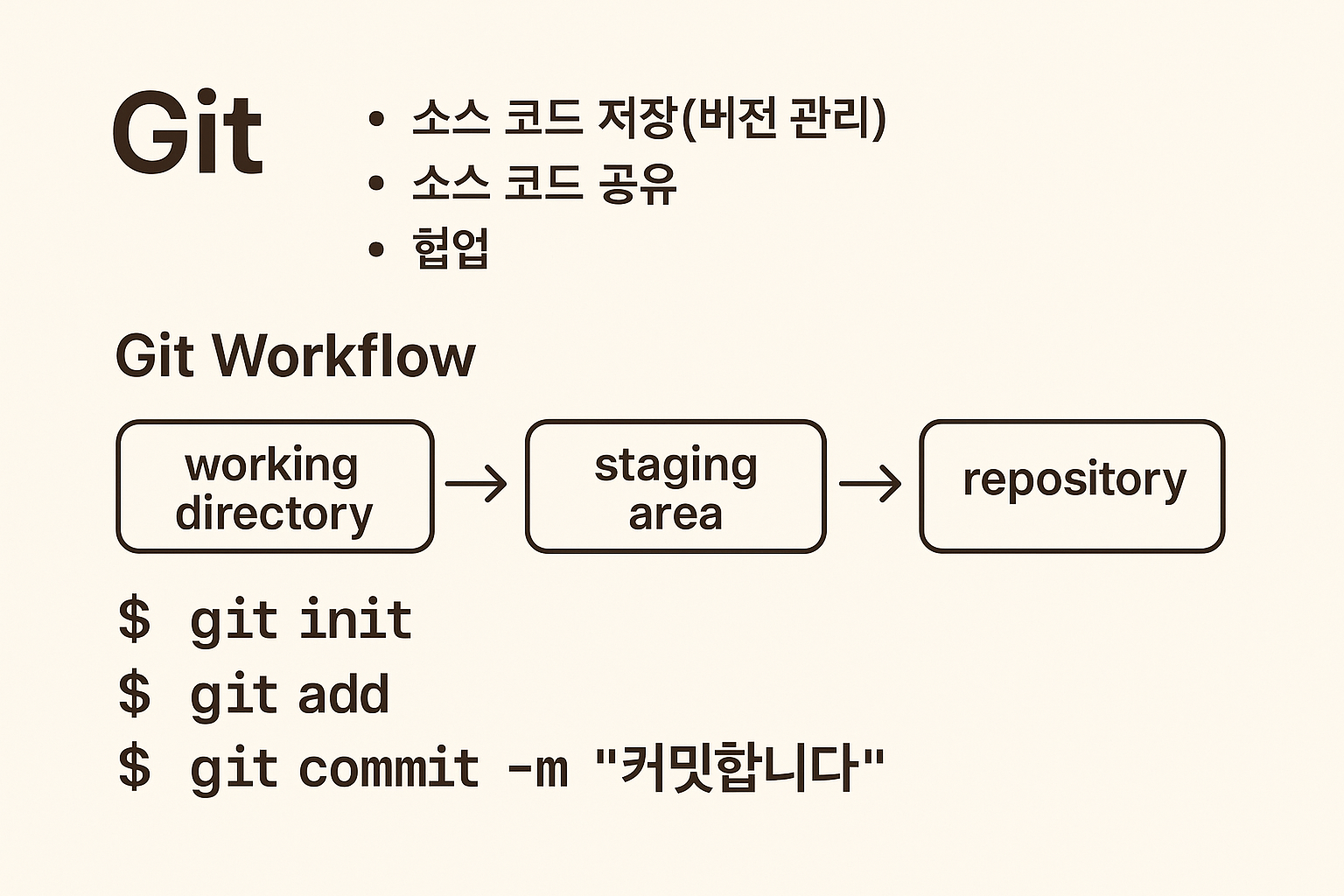 Git이 왜 필요한가?내 소스 코드를 저장(버전 관리)소스코드 공유협업하는 공간Git 사용법git 명령어 -option으로 이루어졌다.ex) git add, git commit, git push 등git init을 하면 .git이라는 폴더와 함께 깃이 관리하는 폴더가 되는 것을 알 수 있다.여기서 . 은 숨겨진 폴더라는 의미이다. 생성된 .git 폴더를 삭제하고 싶다면 rm -rf .git 명령어를 사용하면 된다.Git Workflow총 세가지의 작업 환경으로 나누어져 있다.working directory: 프로젝트의 파일들을 수정하는 곳staging area: 버전 히스토리에 저장할 준비된 파일들이 있는 곳repository: 버전의 히스토리를 가지고 있는 저장소working directoryworki..