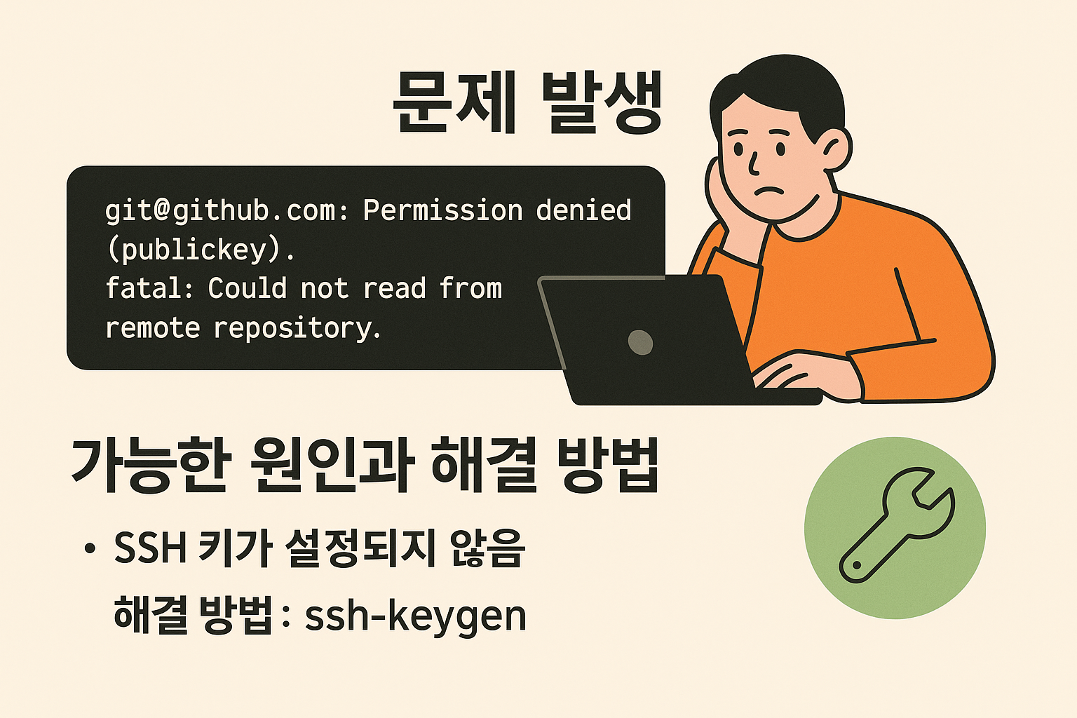 문제 발생git push origin main 명령어를 실행했을 때 git@github.com: Permission denied (publickey). fatal: Could not read from remote repository.라는 오류가 발생했다면, 이는 SSH 인증 문제로 인해 GitHub 원격 저장소에 접근할 수 없다는 뜻입니다.가능한 원인과 해결 방법SSH 키가 설정되지 않았거나 SSH 에이전트에 추가되지 않음해결 방법 :SSH 키가 있는지 확인 ls -al ~/.sshid_rsa나 id_ed25519 같은 파일(및 .pub 파일)이 있는지 확인합니다.키가 없다면 새로 생성ssh-keygen -t ed25519 -C "your_email@example.com"기본 위치를 수락하려면 Enter..