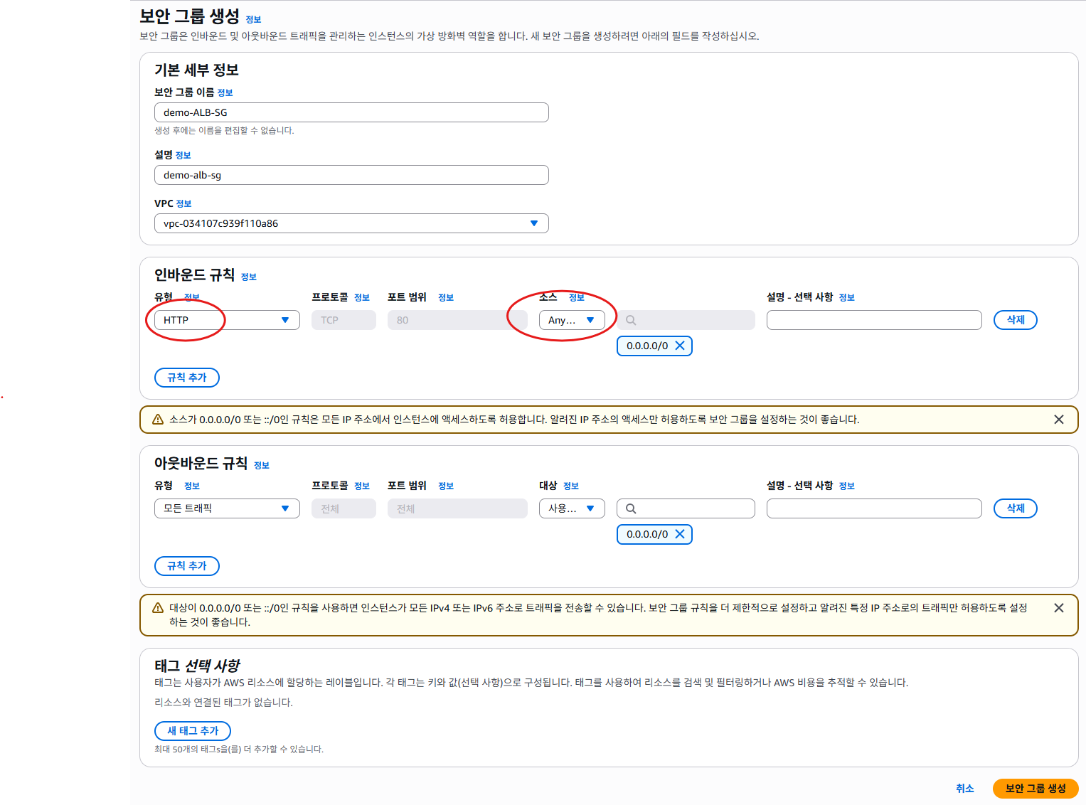 보안그룹에서 ALB를 통해서만 인스턴스에 접근할 수 있게 하기인스턴스에 단독으로 직접 접근 차단보안그룹 생성(로드밸런서용)또 다른 보안 그룹 생성(인스턴스관리용)인바운드 규칙을 앞에서 만든 demo-ALB-SG로 온 트래픽만 받도록 설정 인스턴스의 보안그룹 변경하기방금 만든 demo-EC2-SG를 추가 새로운 보안 그룹이 추가된 모습다른 인스턴스도 보안 그룹을 모두 추가해준다. 로드밸런서도 보안그룹 추가 NACL(Network ACL)서브넷 단위로 적용되는 방화벽 규칙 세트보안그룹과 달리, Stateless 방식인바운드 규칙에 허용을 줬다고 해서 자동으로 아웃바운드가 허용되는 게 아님 -> 반드시 양쪽 방향에 규칙을 따로 설정해야 함특징적용 범위VPC 안에서 서브넷 단위로 적용됨(보안그룹은 EC2 인스턴..