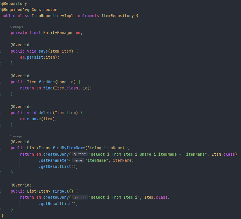- EntityManager를 생성자 주입받기 위해 제어자인 final과 Lombok의 @RequiredArgsConstructor 애노테이션 사용