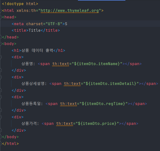 - <html xmlns:th="http://www.thymeleaf.org"> 타임리프를 사용하기 위한 설정