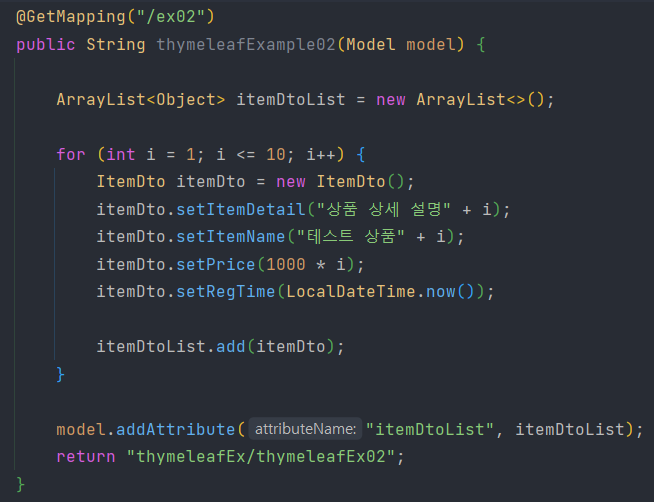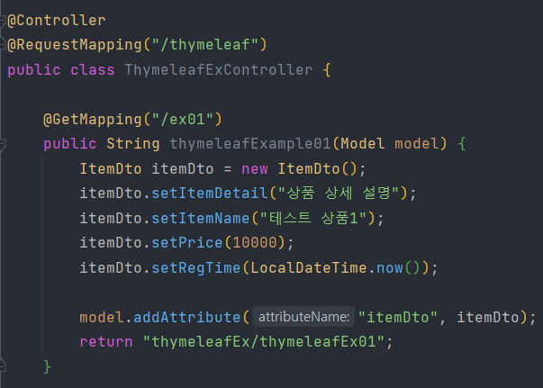 - ItemDto 연습용 Controller 생성 hello.example.controller.ThymeleafExController