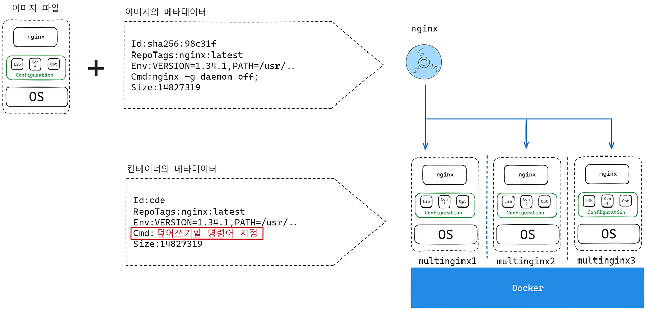 - 이미지를 컨테이너로 실행할 때 CMD에 있는 명령어를 통해서 어떤 프로그램을 실행할지를 메타데이터에서 결정합니다.
