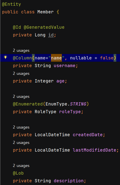 | columnDefinition(DDL) | 데이터베이스 컬럼 정보를 직접 줄 수 있다. 예) varchar(100) default 'EMPTY' |