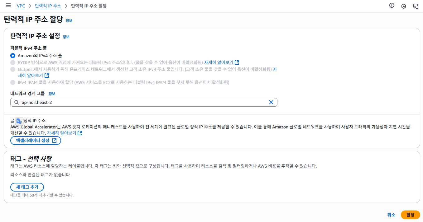 탄력적 IP 할당(일단 VPC 사용 전에 탄력적 IP가 있어야 한다.)